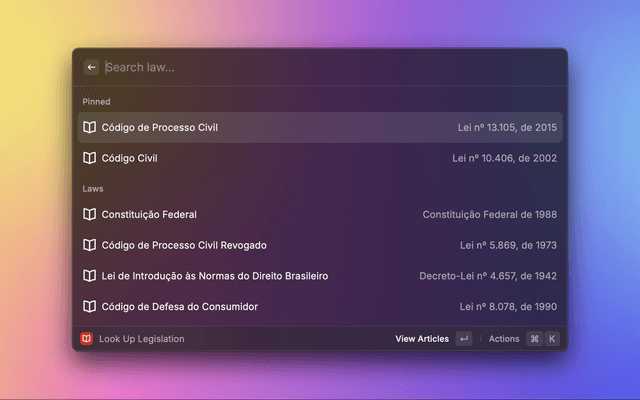 The Vade Mecum extension for Raycast provides a quick and efficient way to access and navigate relevant Brazilian legislation.