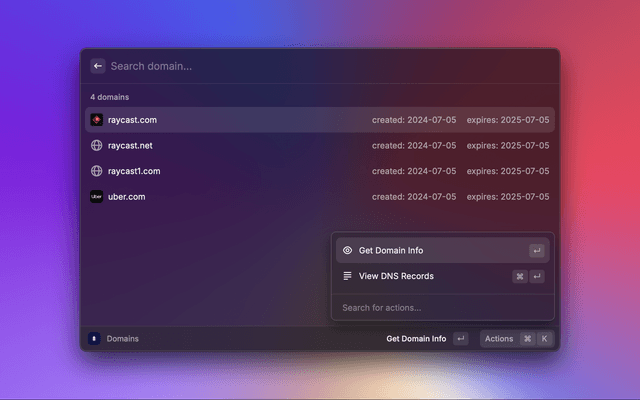 This is a Raycast extension for NameSilo. With this extension, you can fetch latest domain pricing and view Auctions, Domains, Orders, Account Balance. You can also run a Whois Check for a domain.
