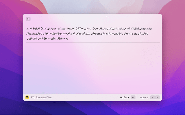 This raycast extension fixes formatting issues in texts that mix Right-to-Left (RTL) and Left-to-Right (LTR) languages, like Kurdish and English.