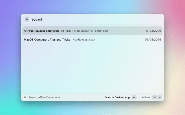 Quick commands to search and open AFFiNE workspaces and documents from Raycast. Uses the AFFiNE GraphQL API (same as DAWNCR0W/affine-mcp-server).