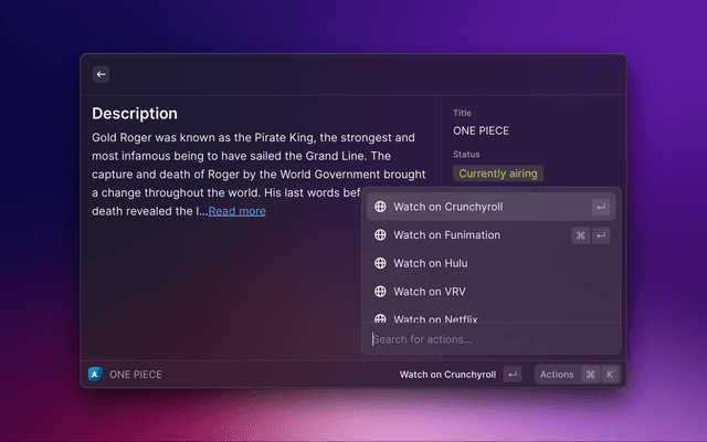 This extension pulls data from Anilist, mainly the airing schedule. Additionally, you can also open the anime to watch on one of the available streaming sites from Raycast itself.